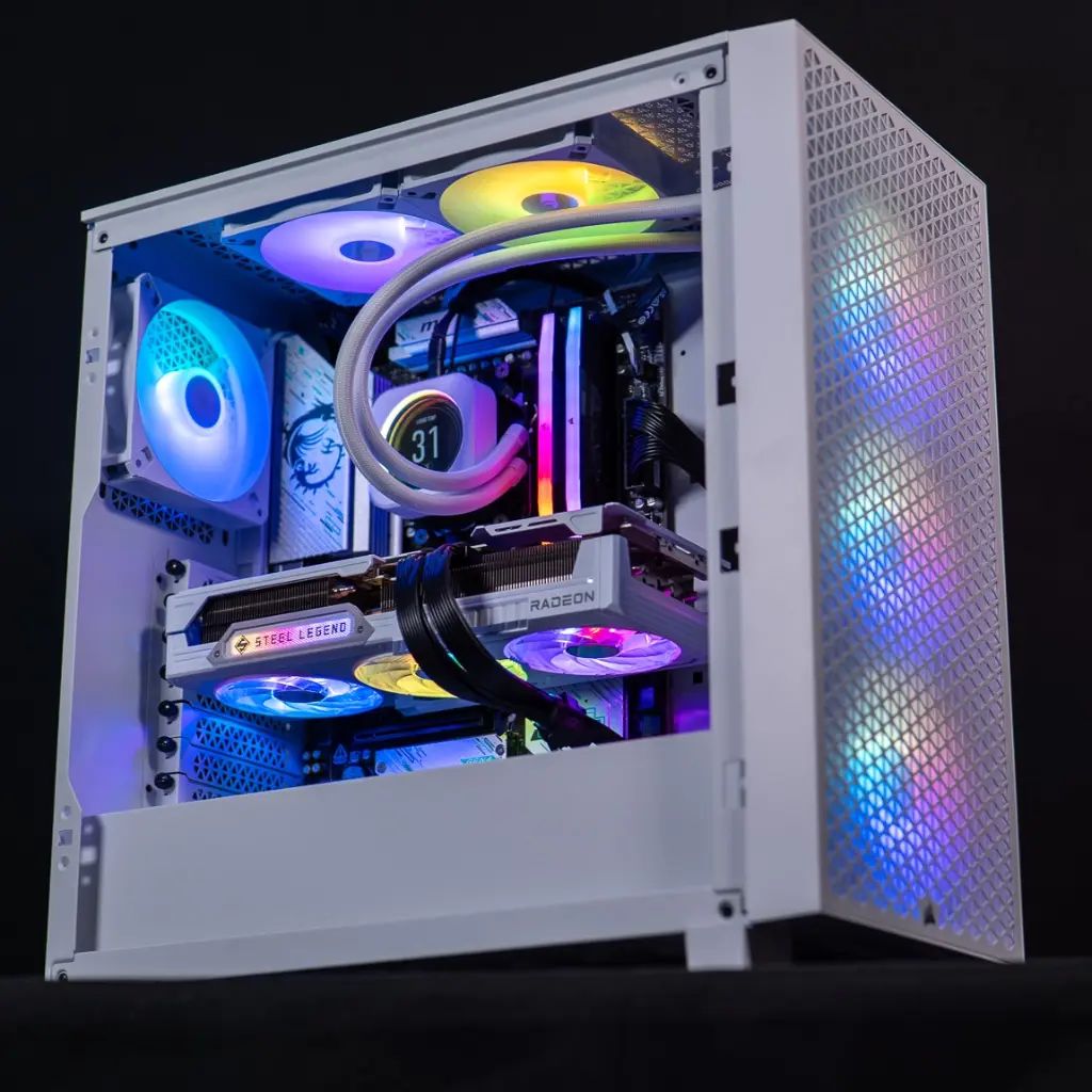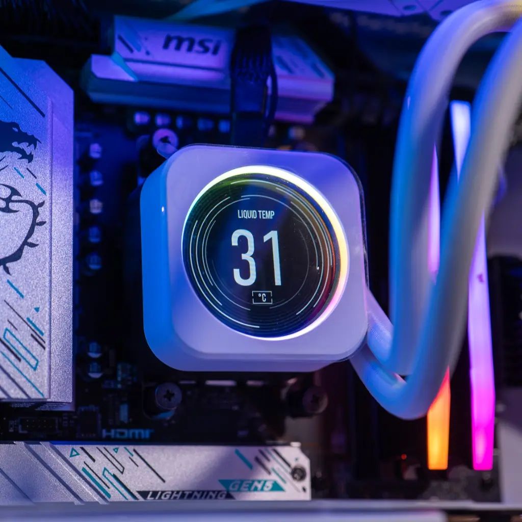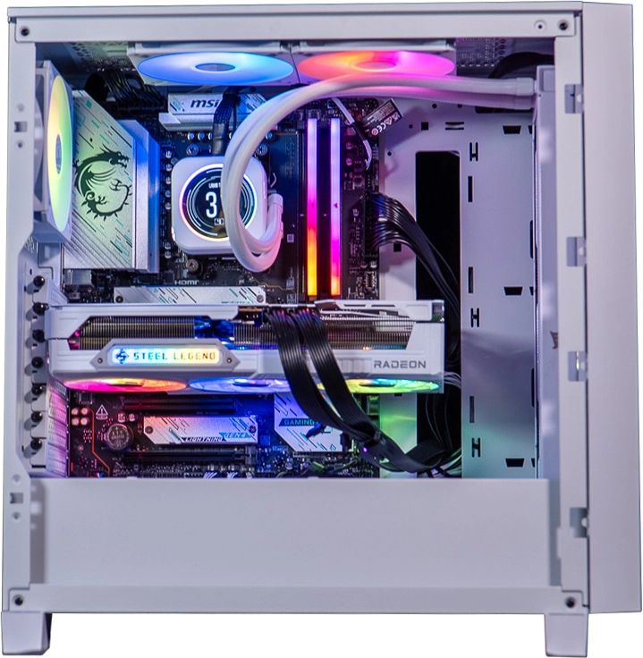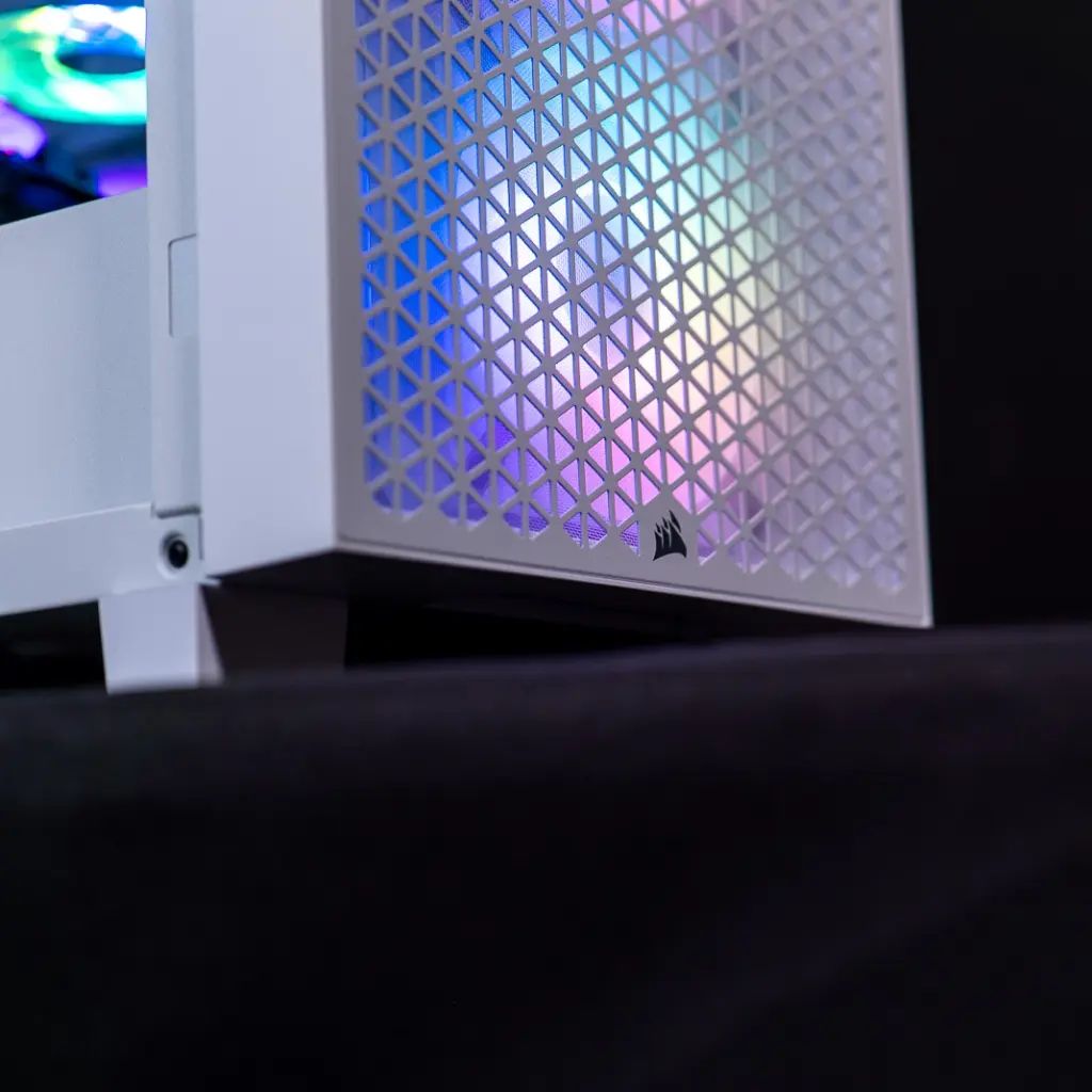 • Gehäuse: Weißer CORSAIR-Tower mit Seitenteil aus gehärtetem Glas, anpassbarem RGB und Flüssigkeitskühlung
